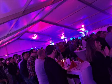 Hier wurde heute Abend eine wirklich sensationelle Party mit rund 200 Gästen gefeiert. Nach zweitägiger Vorbereitung und Aufbau stand heute Abend alles für die geladenen Gäste bereit. Über den roten Teppich gelangten die Gäste in das stilvolle Ambiente. Einem mit unterschiedlicher Bestuhlung, farbiger Ambientebeleuchtung und ansprechend dekoriertem Zelt, das natürlich jetzt im Dezember wohlig beheizt wurde. Nebenan gab es noch ein Garderobenzelt, eine Raucher-Ecke, den Lounge-Bereich sowie einen Luxus-VIP-WC-Wagen vor der Tür.